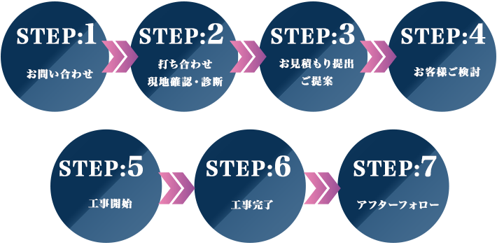 弊社は地域密着でお客様に大変満足頂いており、見積もりから受注、足場工事、塗装工事、アフターフォローまでを自社一貫管理致しております。